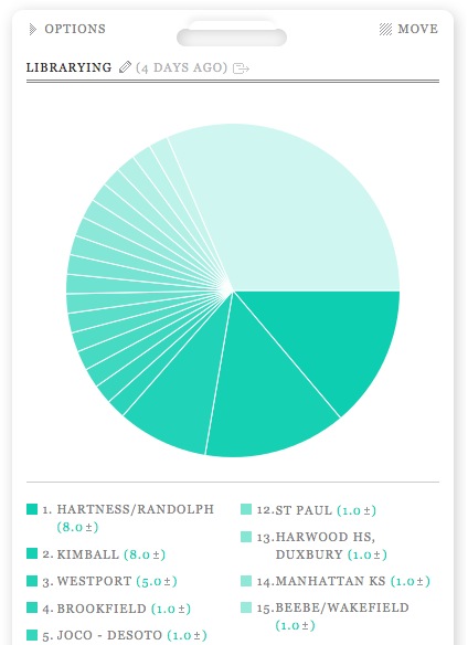 I went to thirty-six different libraries in seven states and two non-US countries for eighty visits total. A bunch more than last year, but some were just for ukulele practice or tech planning sessions at a friend’s library. Here’s the short annotated list of what I was doing in libraries last year. Top three libraries are: my local public, my local academic and my summer local.